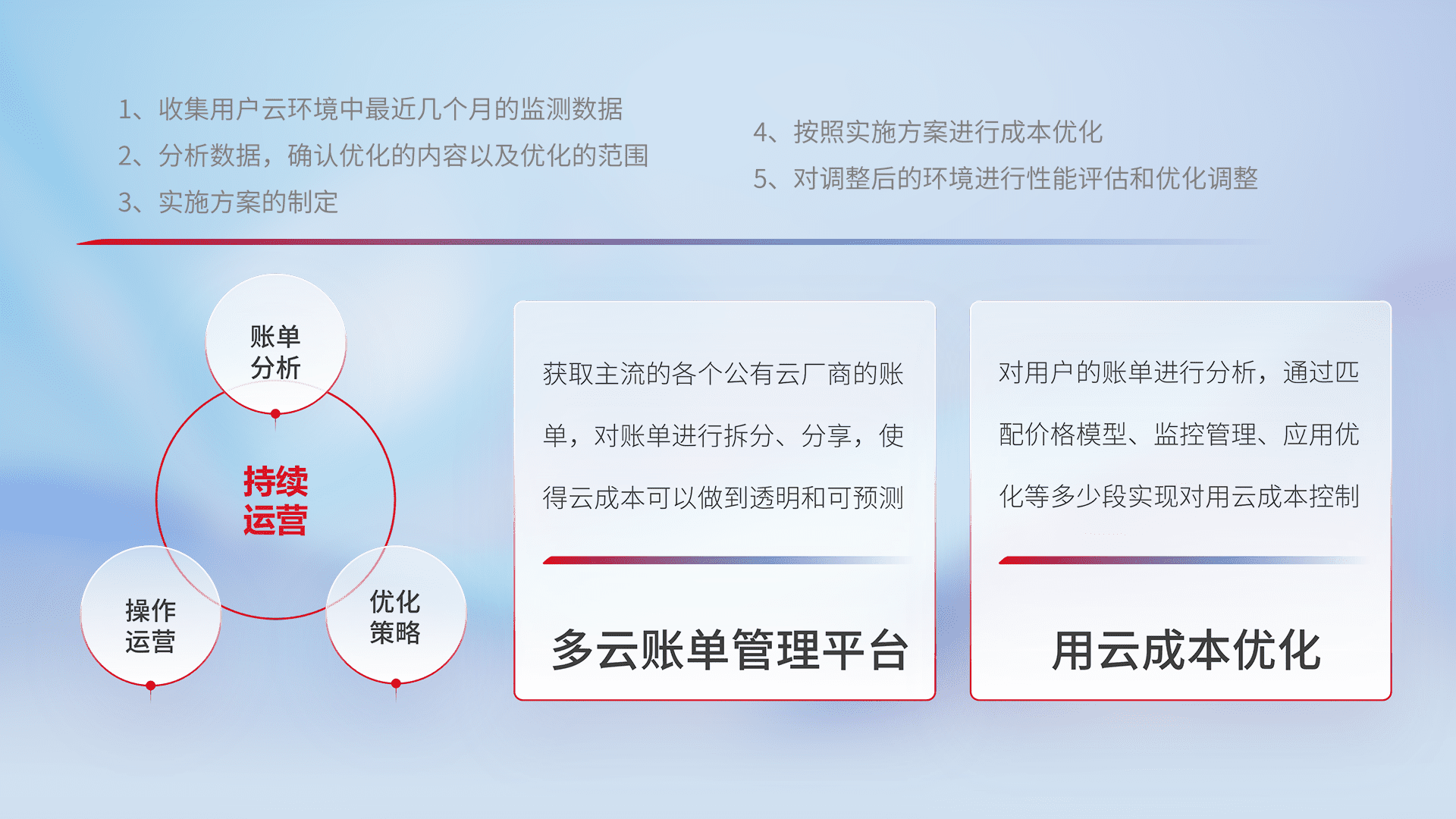 通过多云纳管,,,,以统一的资源数据模型把客户的云资源进行抽象和封装,,,,进而实现对多云资源的统一操作,,,保障云资源管理的可靠性、、稳定性与可用性。。。。量身定制化运维内容,,配置、、、、开发运维、、、补丁管理、、、、备份、、监控、、、认证和访问管理、、审计和日常巡检等,,保障在用云过程中的可靠度,,,稳定度以及高可用率。。。